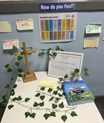 Reflective areas in classrooms and outside invite pupils to extend reflection and prayer beyond gathering for worship.